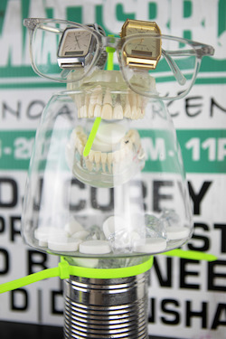 Dentists Aid, Retired Glasses, Vintage Casio watches, Found Glass, Used Bean Can, Florescent cable ties, Florescent Clipper lighter (on), Extra strong mints, Plastic diomonds, Correx Rave Sign, IKEA Shelf