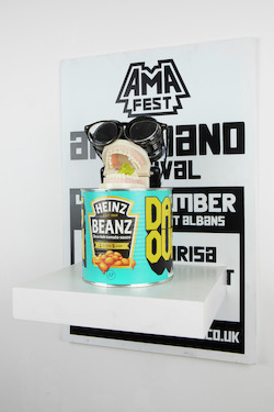Head made from hardened excrement with beaded teeth, wooden arms, ceramic body, found glass ‘spaceship’, hot dog can (full)
